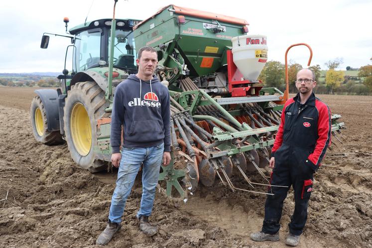 Aurélien Ragot a débuté ses semis d’automne le lundi 27 octobre pour un chantier d’au minimum 15 jours. Cette année, il a 38 ha à semer. « Je sème les 38 ha avec un mélange de triticale et de féverole, qui est destiné à l'autoconsommation alimentaire de mes animaux. En même temps, je sème un trèfle violet grâce à un petit semoir que mon salarié a adapté sur le semoir initial. Le but est d’effectuer les deux semis pour les deux années, en un seul passage », détaille Aurélien Ragot. Une technique qui évite aussi à l’éleveur laitier « d’avoir à travailler le sol. Sinon, il aurait fallu resemer le trèfle après la moisson, complète-t-il. Cela évite également de retourner les champs fin août-début septembre, une période où les terres sont bien sèches ».
