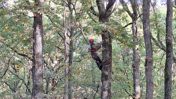 Équipé de son harnais, de ses griffes à chaque pied, de longes et de sa tronçonneuse, Antoine Beautemps monte le long du tronc d’un chêne. Méticuleux, il coupe toutes les petites branches qui freinent son ascension, jusqu’à atteindre le houppier, soit la partie de l'arbre qui sépare la première grosse branche de son sommet. Avec dextérité, en une dizaine de minutes seulement, les branches tombent une par une. Et le bûcheron éhouppeur (élagueur en milieu forestier) remet le pied sur le plancher des vaches.