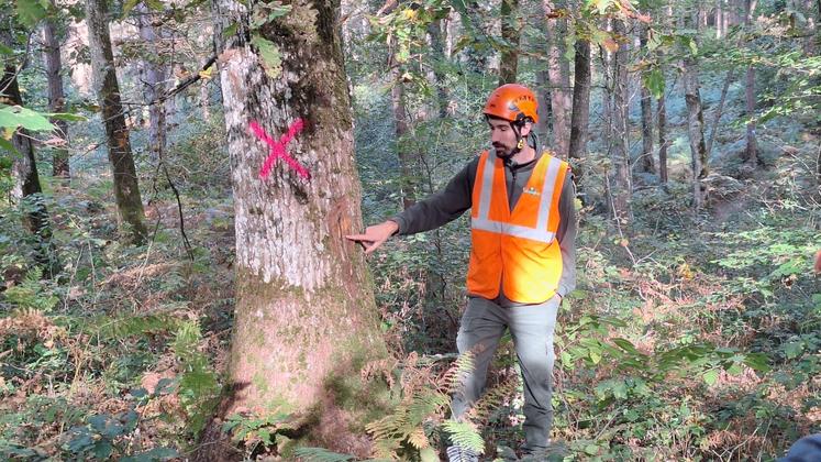 « Il s’agit d’expliquer les enjeux de l’exploitation forestière au grand public, et notamment de comprendre pourquoi des arbres sont coupés », débute Yann Petiot, qui poursuit : « L’abattage manuel et l’éhouppage sont des gestes qui demandent beaucoup de technique. » Aujourd’hui, le chantier consiste en « une intervention classique dans la vie du peuplement d’une forêt », poursuit Gabriel Raymond. Ce dernier, en amont de cette journée, est venu sur place pour marquer certains arbres avec de la peinture : « Celui avec le point jaune, c’est le bel arbre que l’on veut préserver en lui faisant plus de place. Les autres traits orange, ce sont ceux qui vont être abattus. »