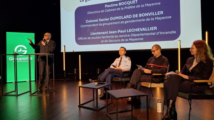 Le colonel Xavier Dumolard de Bonviller, commandant du Groupement de Gendarmerie de la Mayenne ; le lieutenant Jean-Paul Lechevallier, officier de soutien territorial au Sdis (Service départemental d’incendie et de secours), et Pauline Bocquet, directrice de cabinet de la préfète, ont pris place devant l’auditoire afin de répondre aux questions de Johann Koullepis, journaliste chroniqueur et animateur de la table ronde. Pauline Bocquet a rappelé le rôle de coordination des services de l’État « avec l’ensemble des forces de sécurité », et l’intérêt de « travailler sur les crises traversées pour mieux préparer celles à venir ».